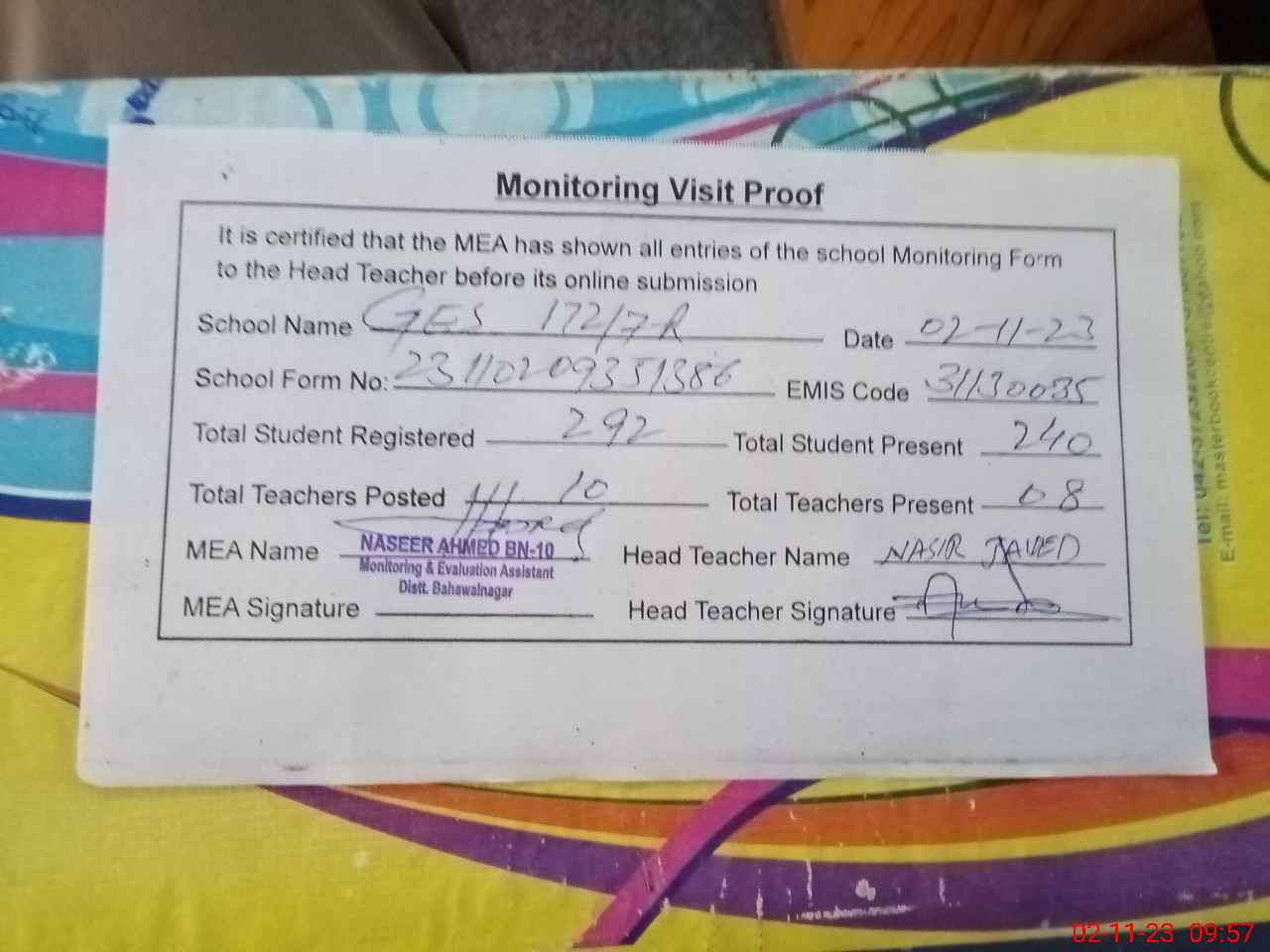 | Attendance Register | Head Teacher | MEA with School | Visit Proof |