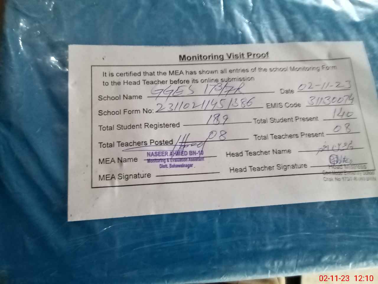 | EMIS Code: 31130074 | Name of School: GGES CHAK NO.173/7-R (W) | |||