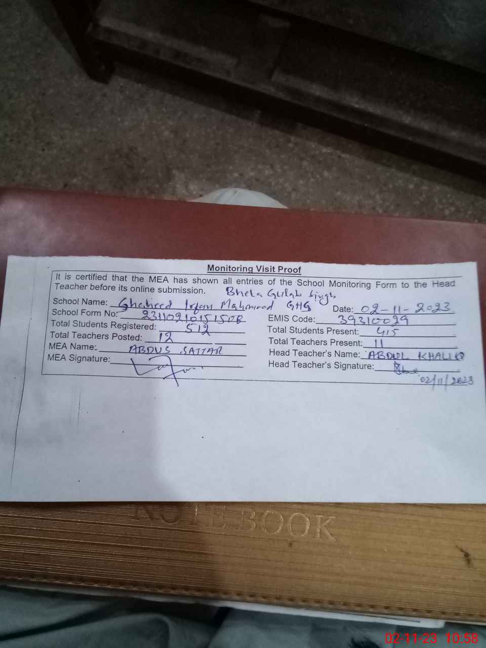 | Attendance Register | Head Teacher | MEA with School | Visit Proof |