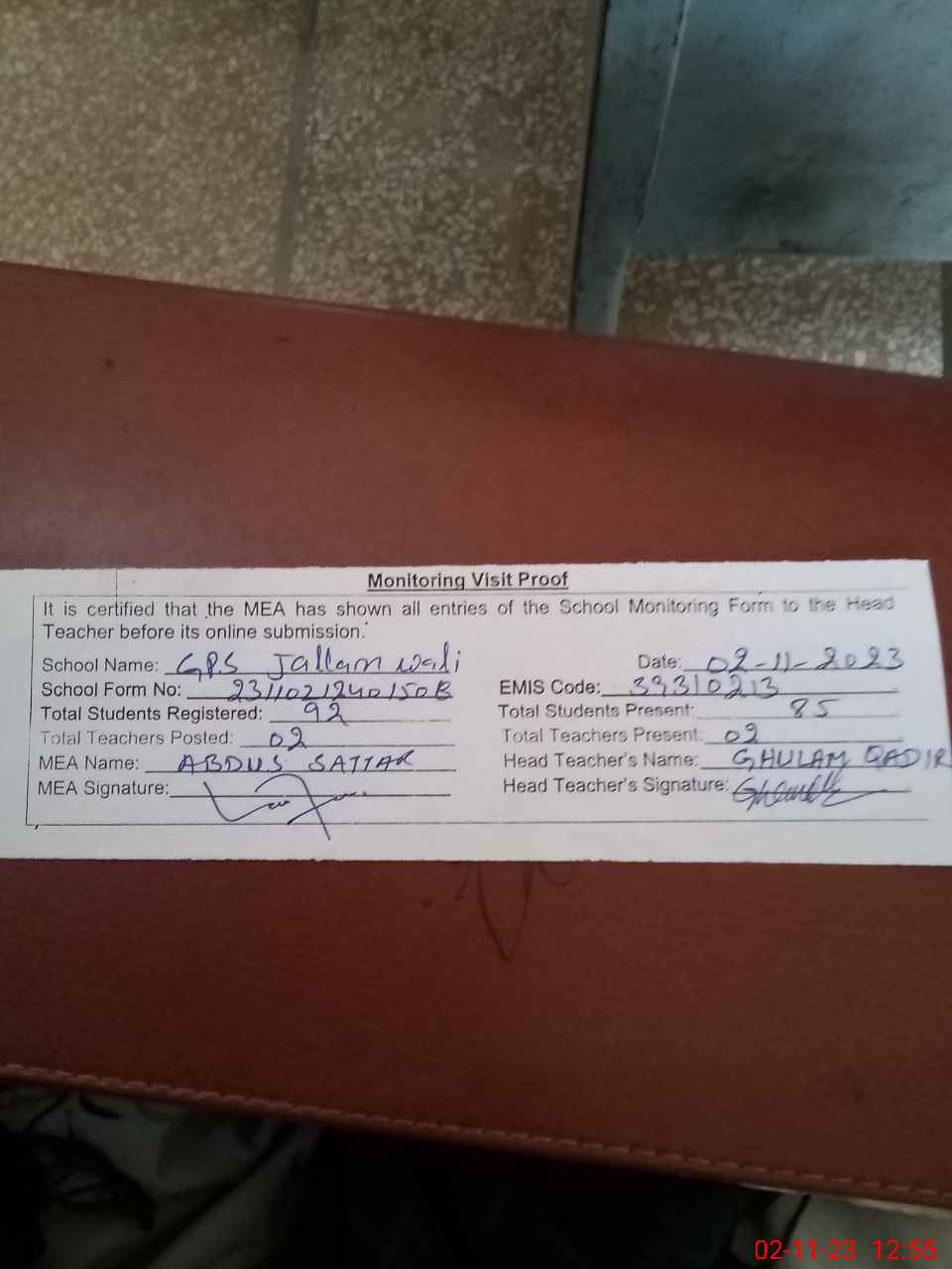 | Attendance Register | Head Teacher | MEA with School | Visit Proof |