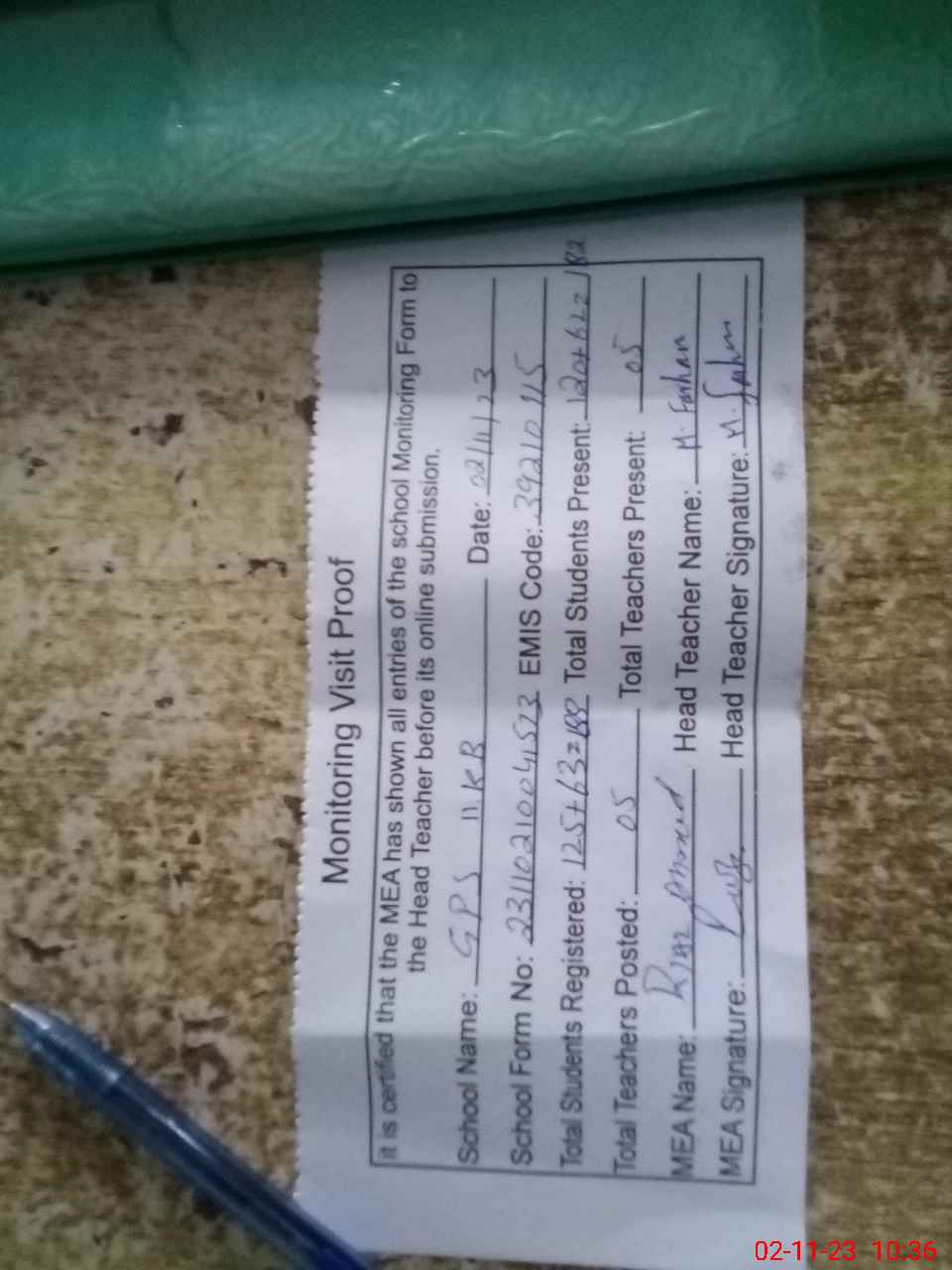 | Attendance Register | Head Teacher | MEA with School | Visit Proof |