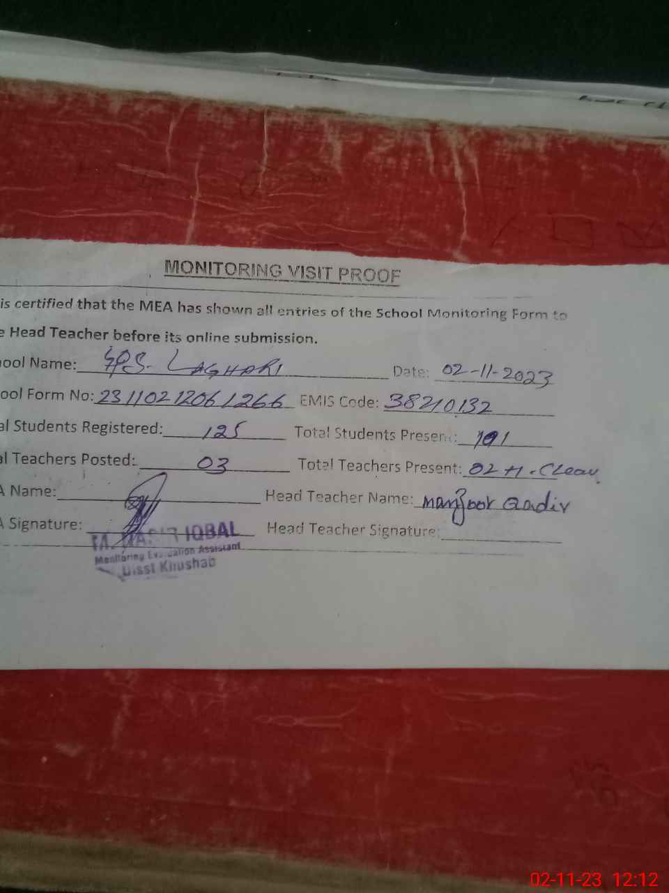 | Attendance Register | Head Teacher | MEA with School | Visit Proof |