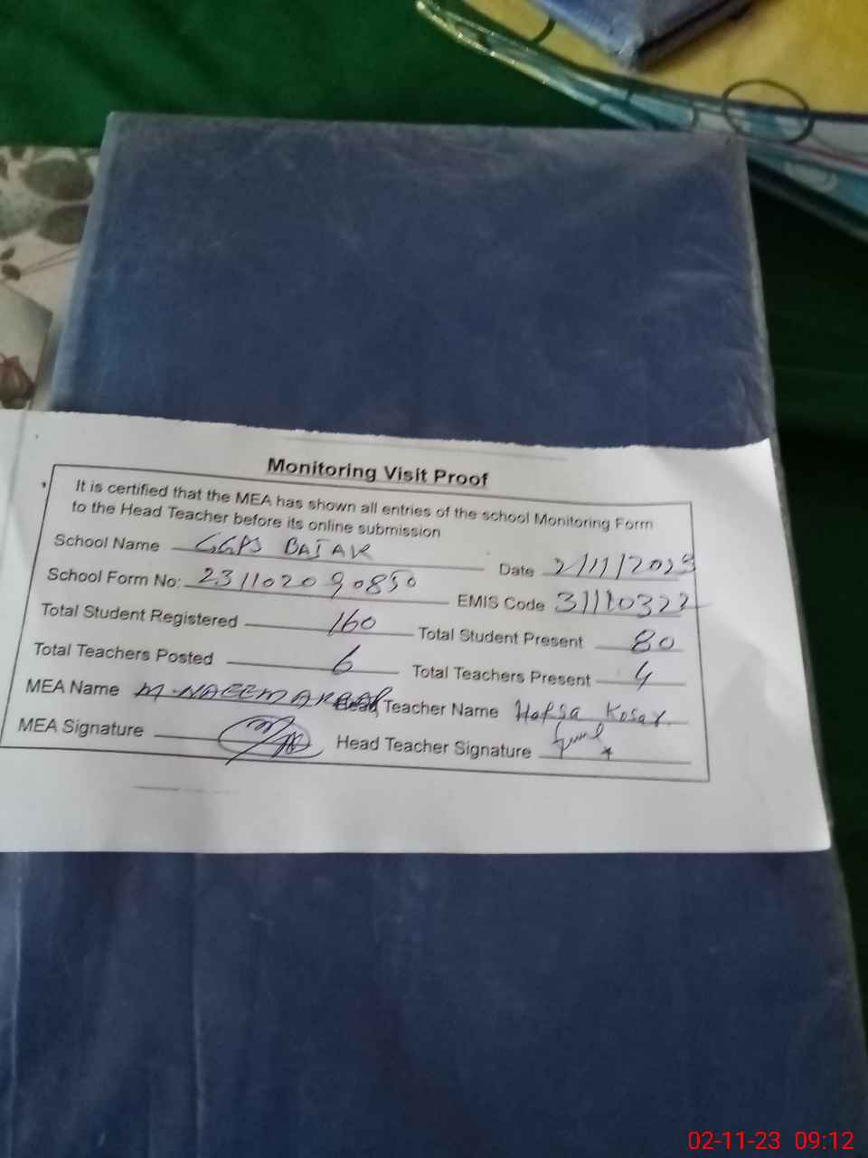 | Attendance Register | Head Teacher | MEA with School | Visit Proof |