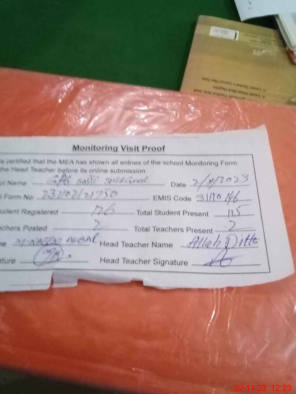| Attendance Register | Head Teacher | MEA with School | Visit Proof |