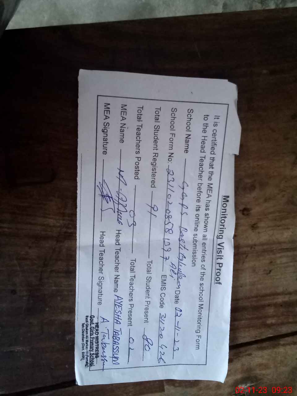 | Attendance Register | Head Teacher | MEA with School | Visit Proof |
