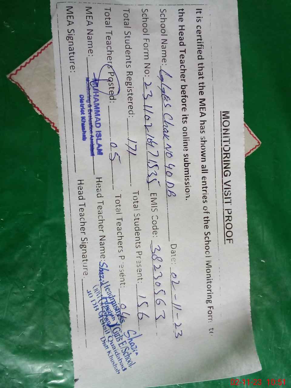 | EMIS Code: 38230563 | Name of School: GGES CHAK NO.40 DB | |||