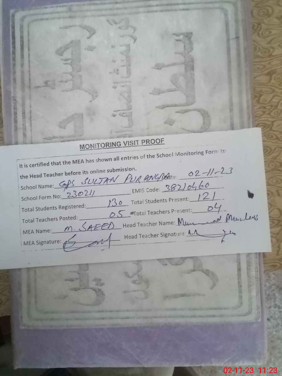 | Attendance Register | Head Teacher | MEA with School | Visit Proof |