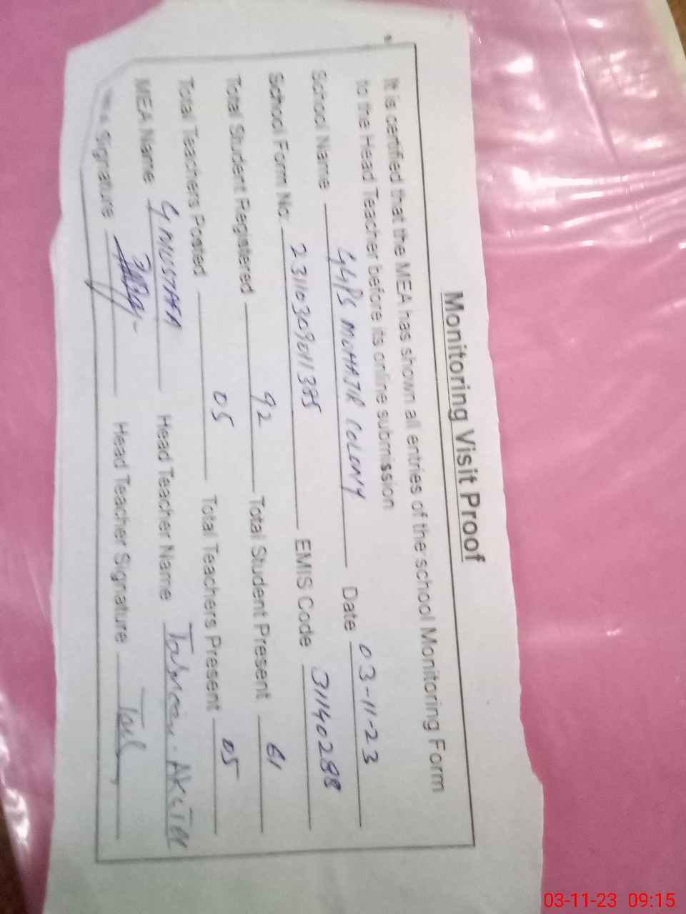 | Certified that this School was Inspected by the Undersigned MEA/DMO Today and the Information Stated Above is as Per Record. | |||||