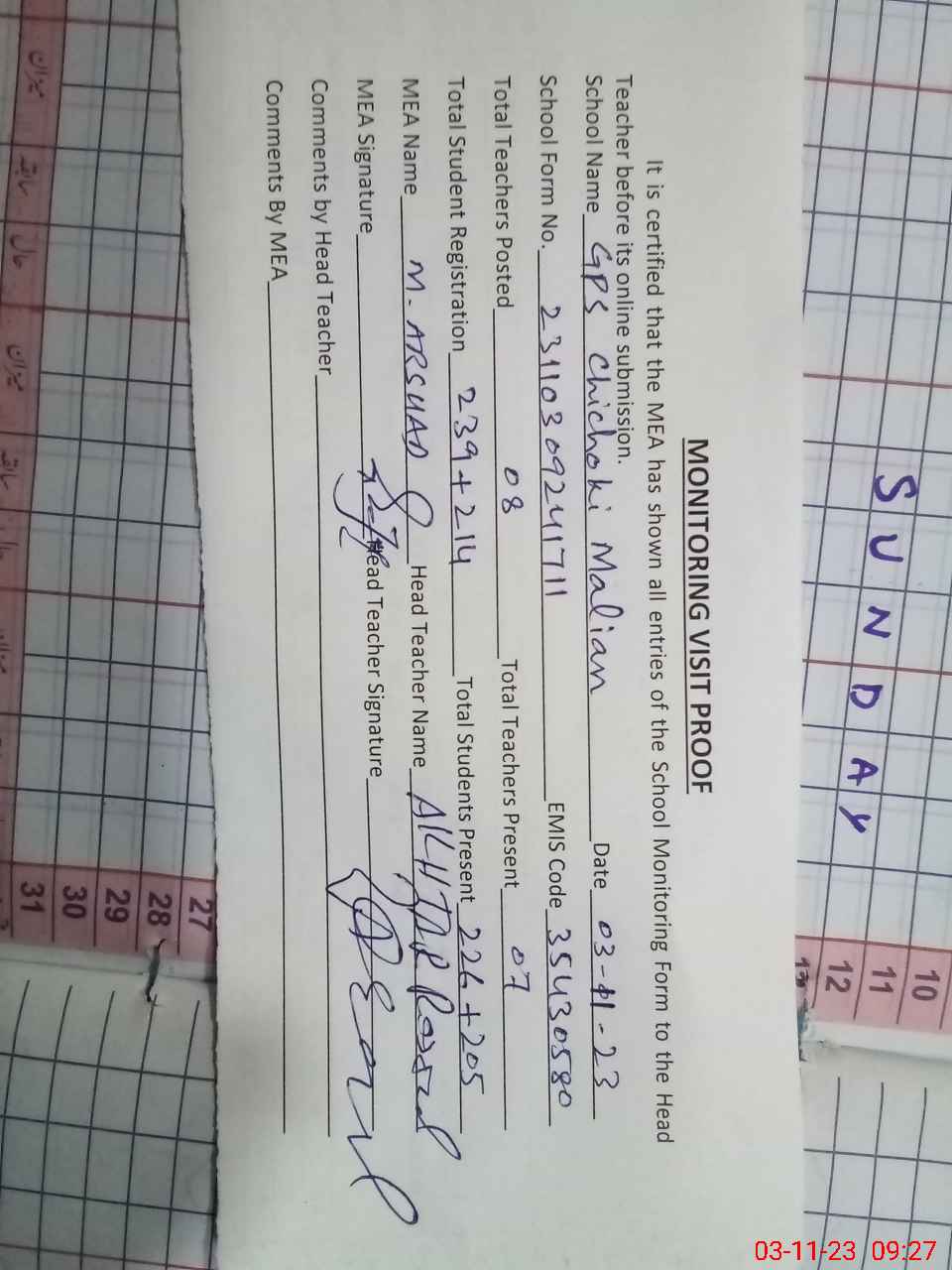 | Attendance Register | Head Teacher | MEA with School | Visit Proof |