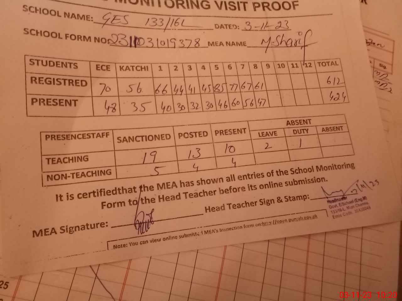 | Attendance Register | Head Teacher | MEA with School | Visit Proof |