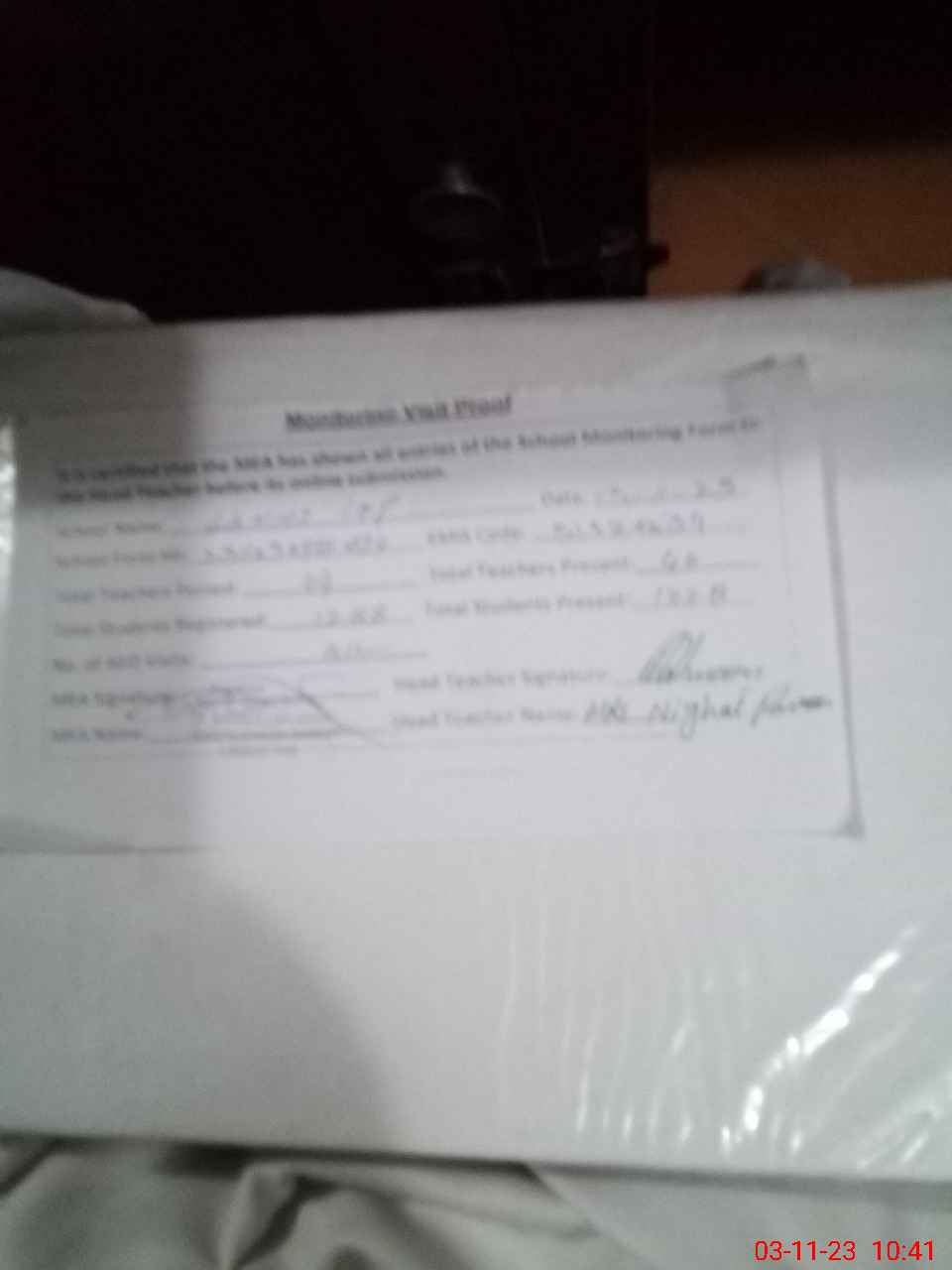 | Monitoring Date: 03-11-2023 | Start Time: 03-11-2023 09:44 AM | End Time: 03-11-2023 10:42 AM | Name of MEA: Mu**** Sa**** Ul**** Sa**** | |