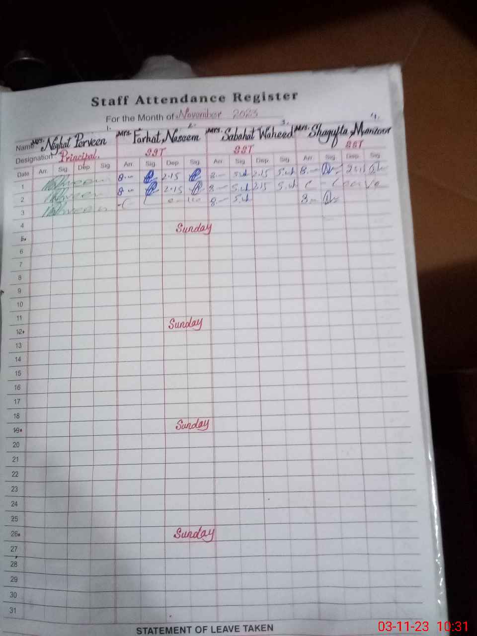 | CNIC | Full Name | Designation | R/C | Absence During Last Calender Month |