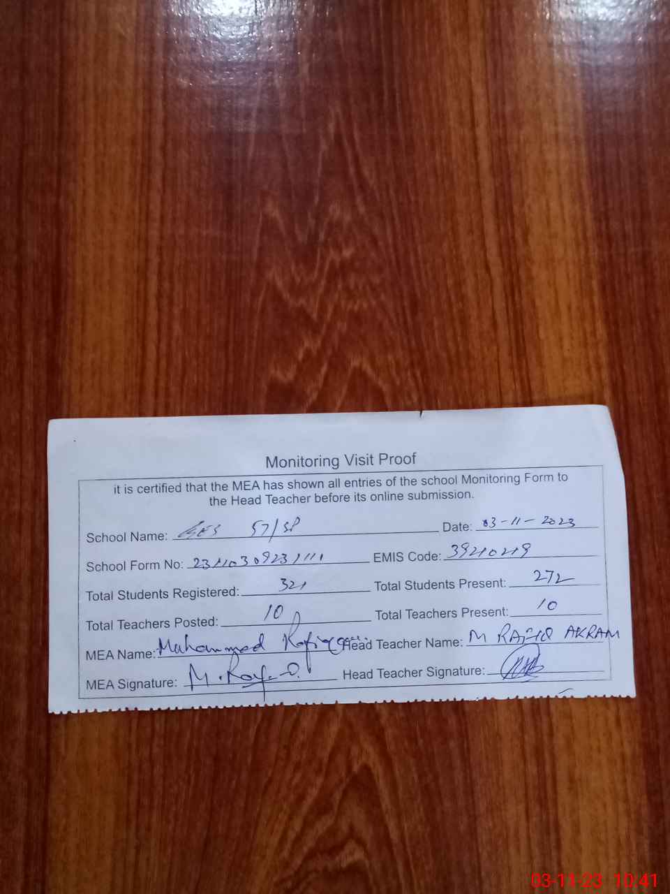 | Attendance Register | Head Teacher | MEA with School | Visit Proof |