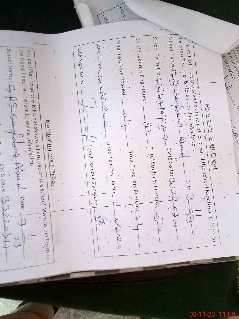 | Attendance Register | Head Teacher | MEA with School | Visit Proof |