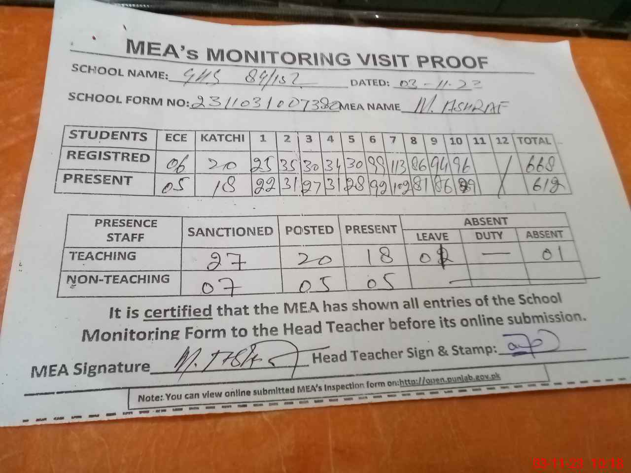 | Attendance Register | Head Teacher | MEA with School | Visit Proof |