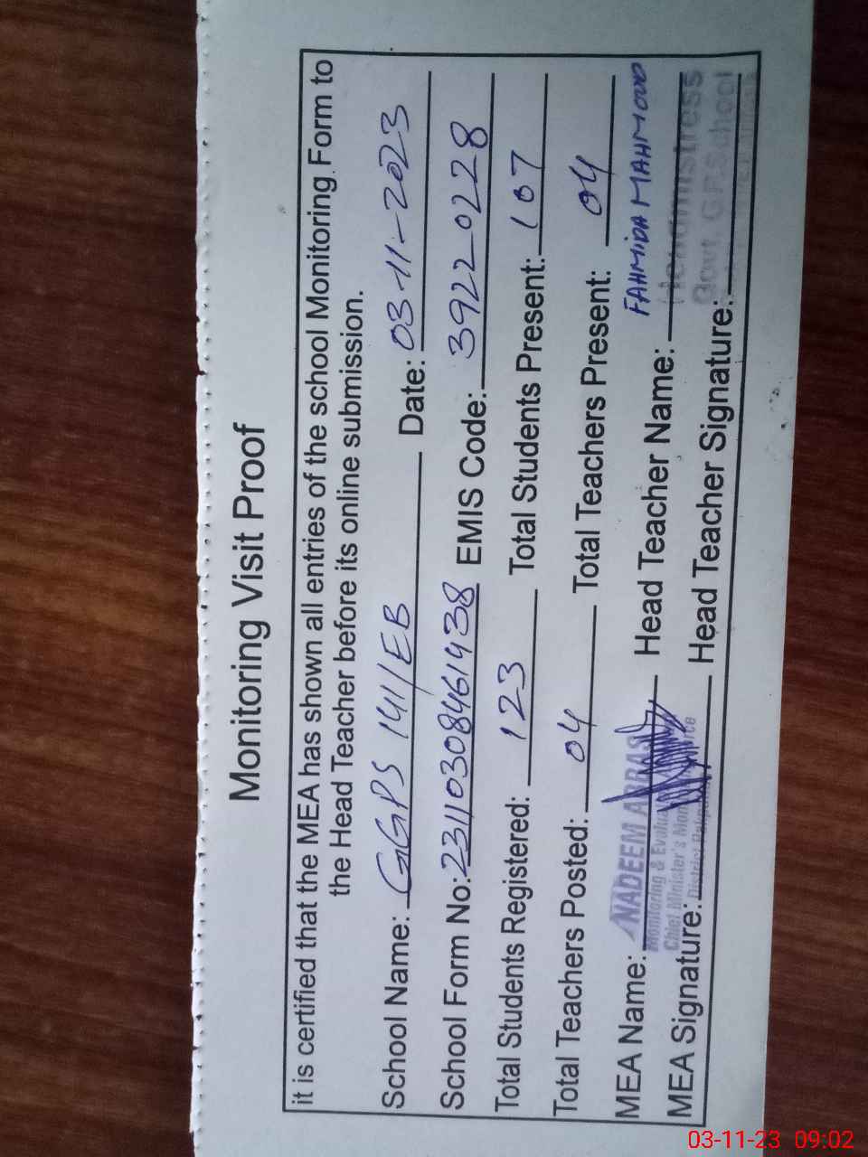 | Attendance Register | Head Teacher | MEA with School | Visit Proof |