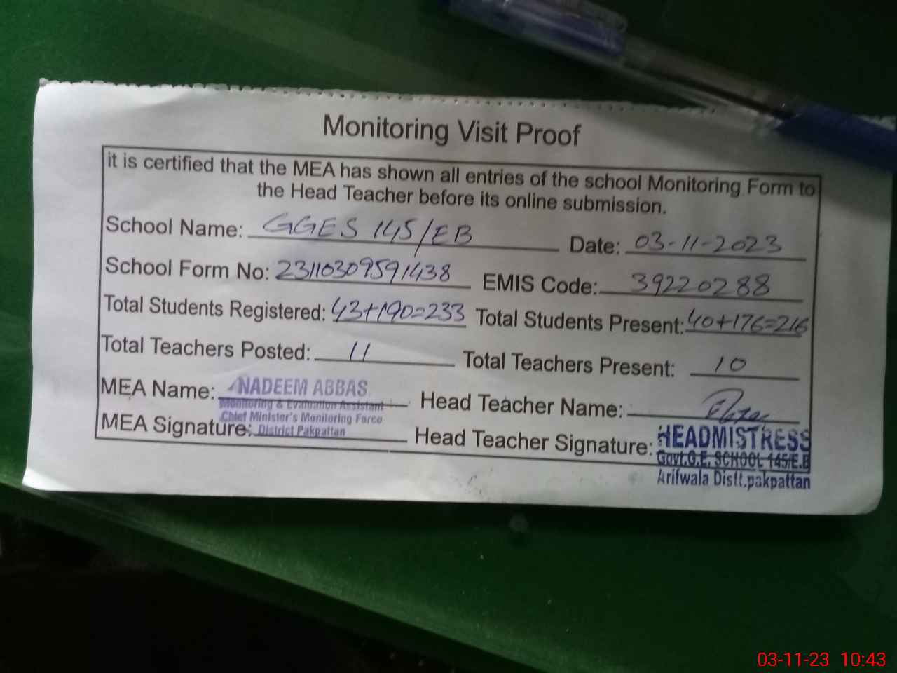 | Certified that this School was Inspected by the Undersigned MEA/DMO Today and the Information Stated Above is as Per Record. | |||||