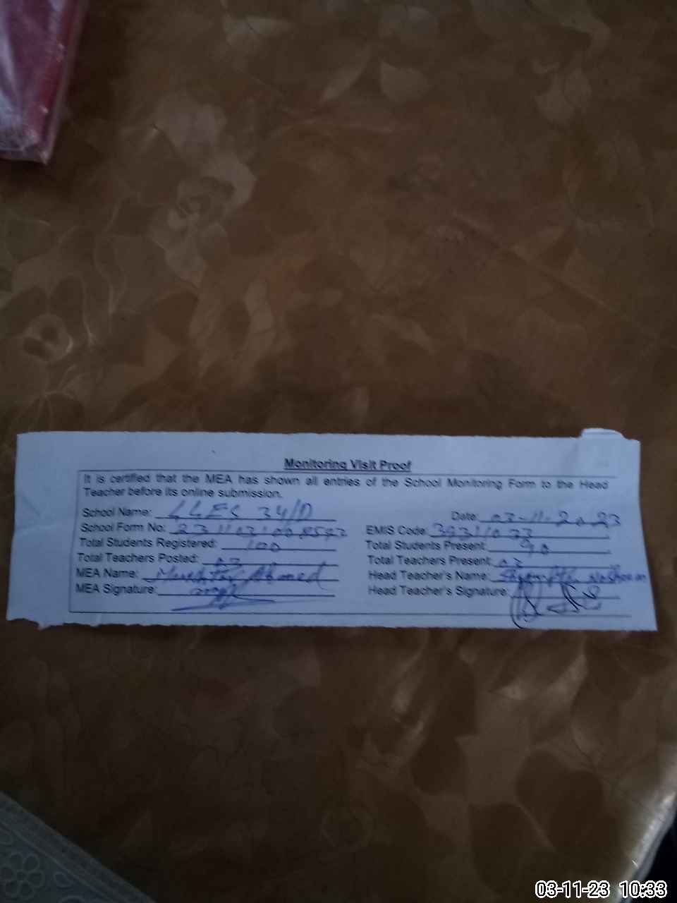 | Attendance Register | Head Teacher | MEA with School | Visit Proof |