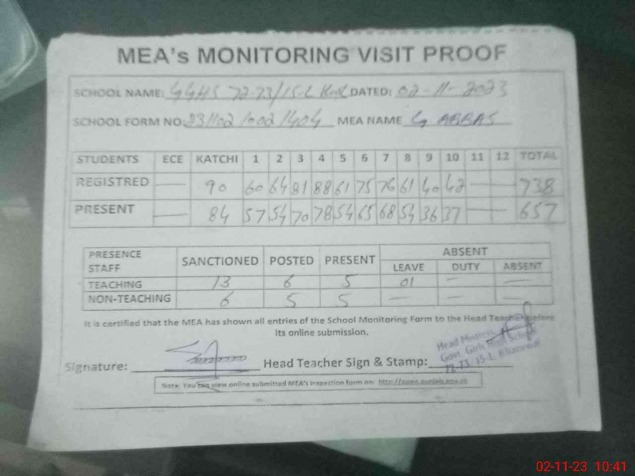 | Attendance Register | Head Teacher | MEA with School | Visit Proof |