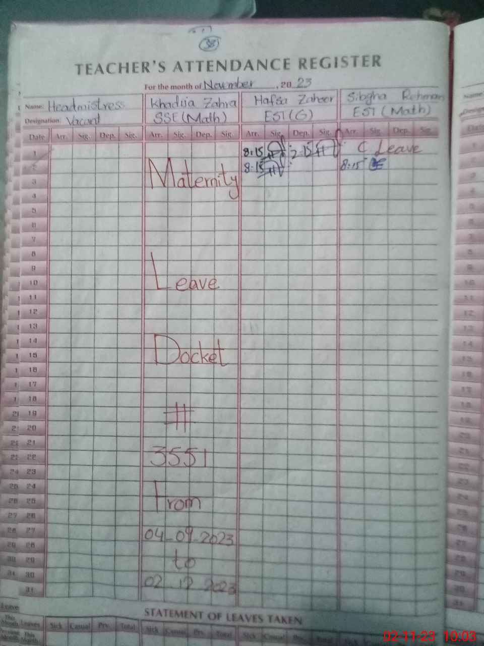 | 33**** | Kh**** Za**** | 2 | 31 | 0 | 0 | 31 | 0 | 0 | 0 | 0 | 0 | Maternity | |