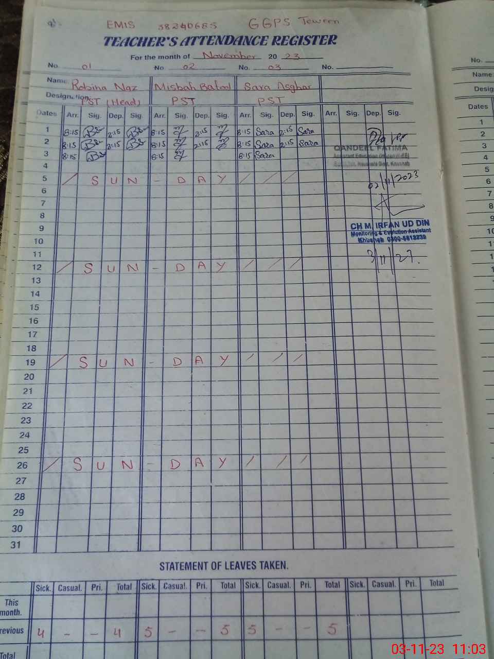 | CNIC | Full Name | Designation | R/C | Absence During Last Calender Month |