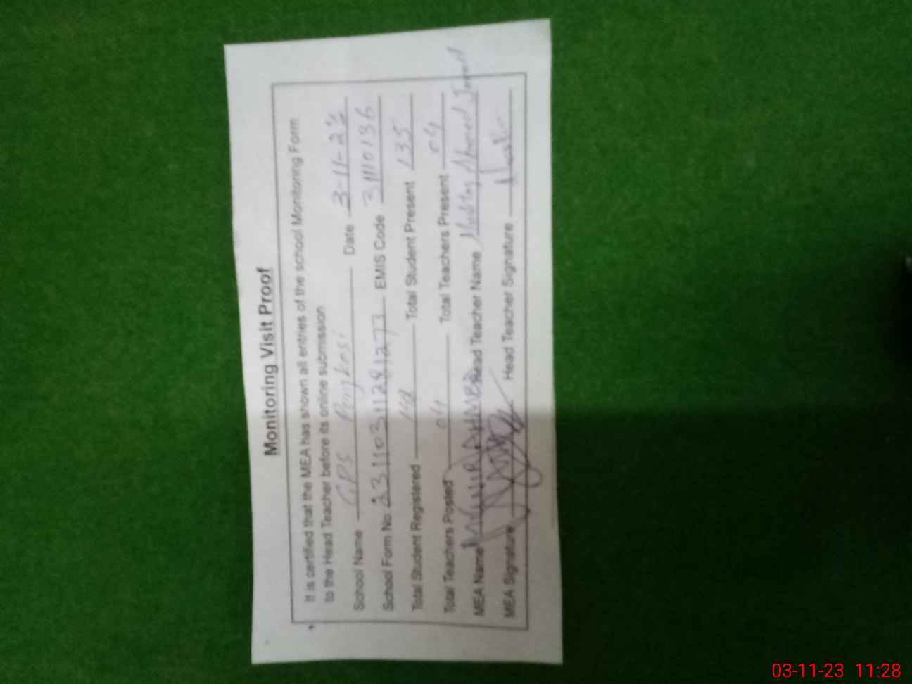 | Attendance Register | Head Teacher | MEA with School | Visit Proof |