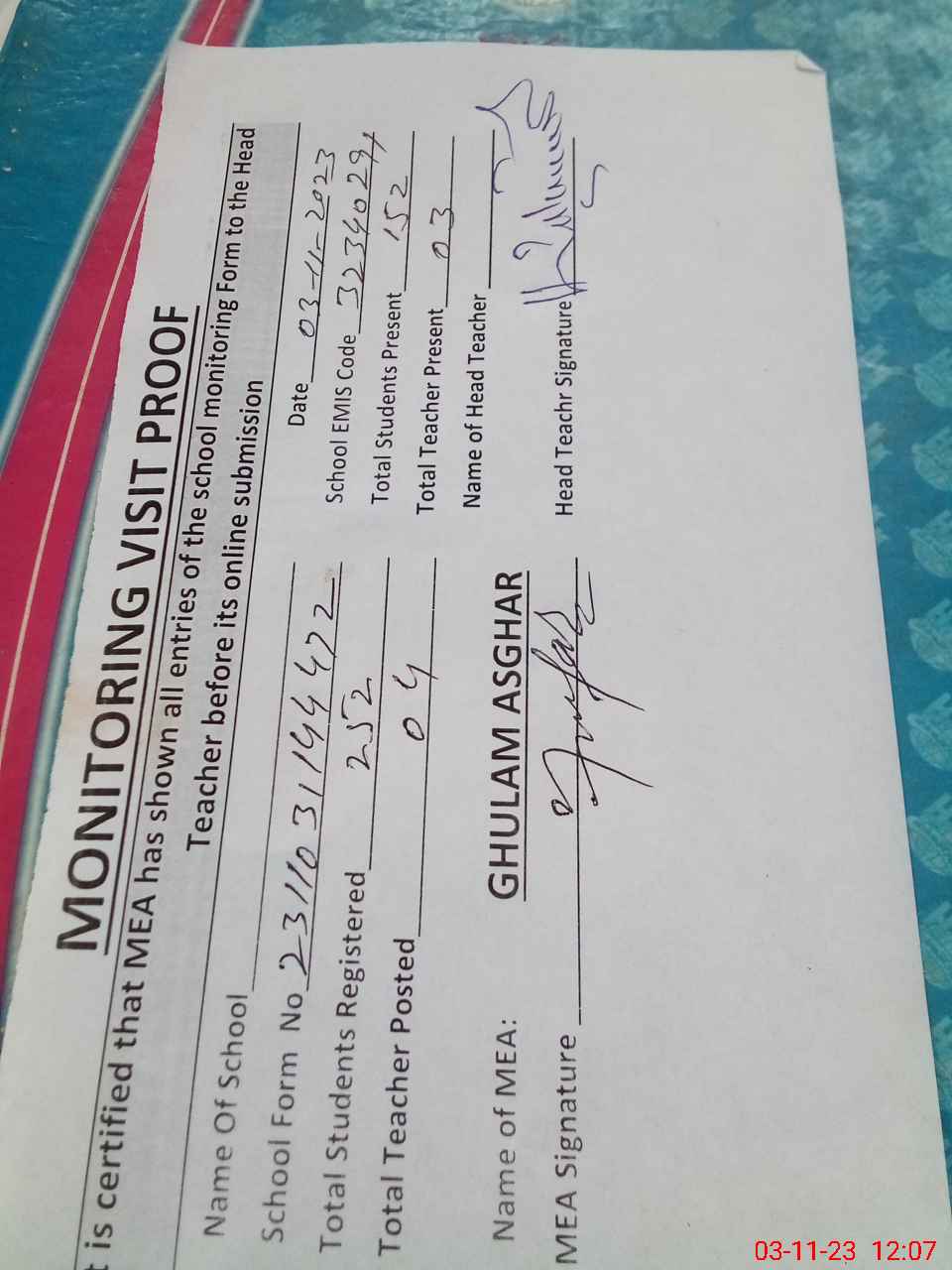 | Attendance Register | Head Teacher | MEA with School | Visit Proof |