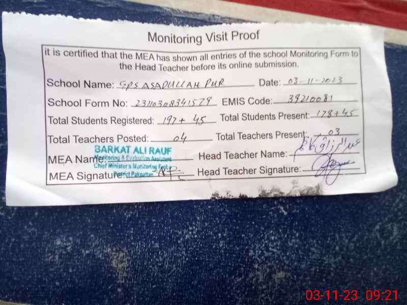 | EMIS Code: 39210081 | Name of School: GPS ASADULLAH PUR | |||