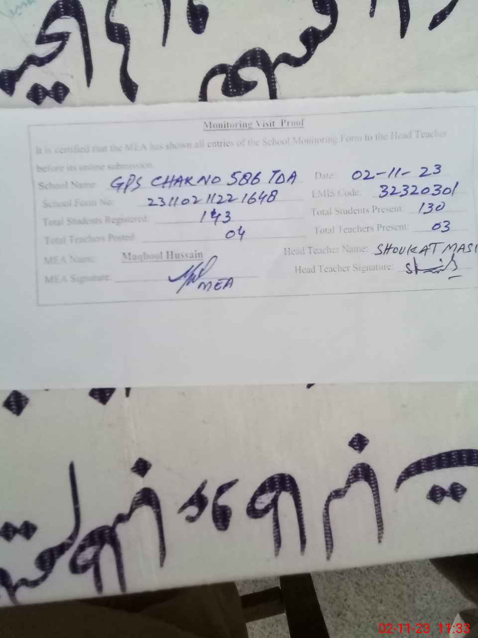 | EMIS Code: 32320301 | Name of School: GPS CHAK NO.586 TDA | |||