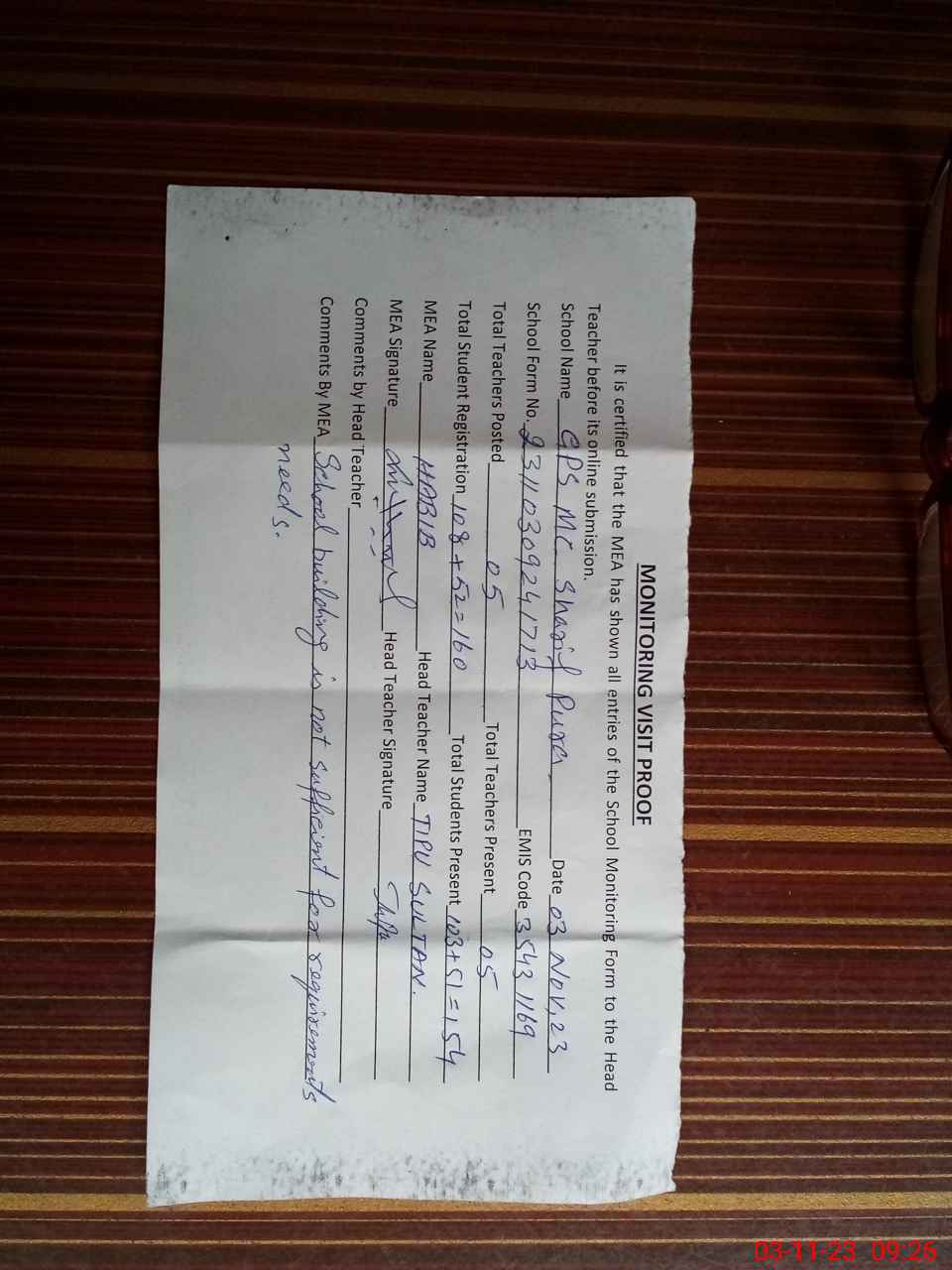 | EMIS Code: 35431169 | Name of School: GPS MC MOHALLAH SHARIF PURA | |||