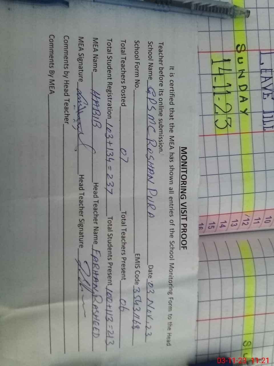 | Attendance Register | Head Teacher | MEA with School | Visit Proof |