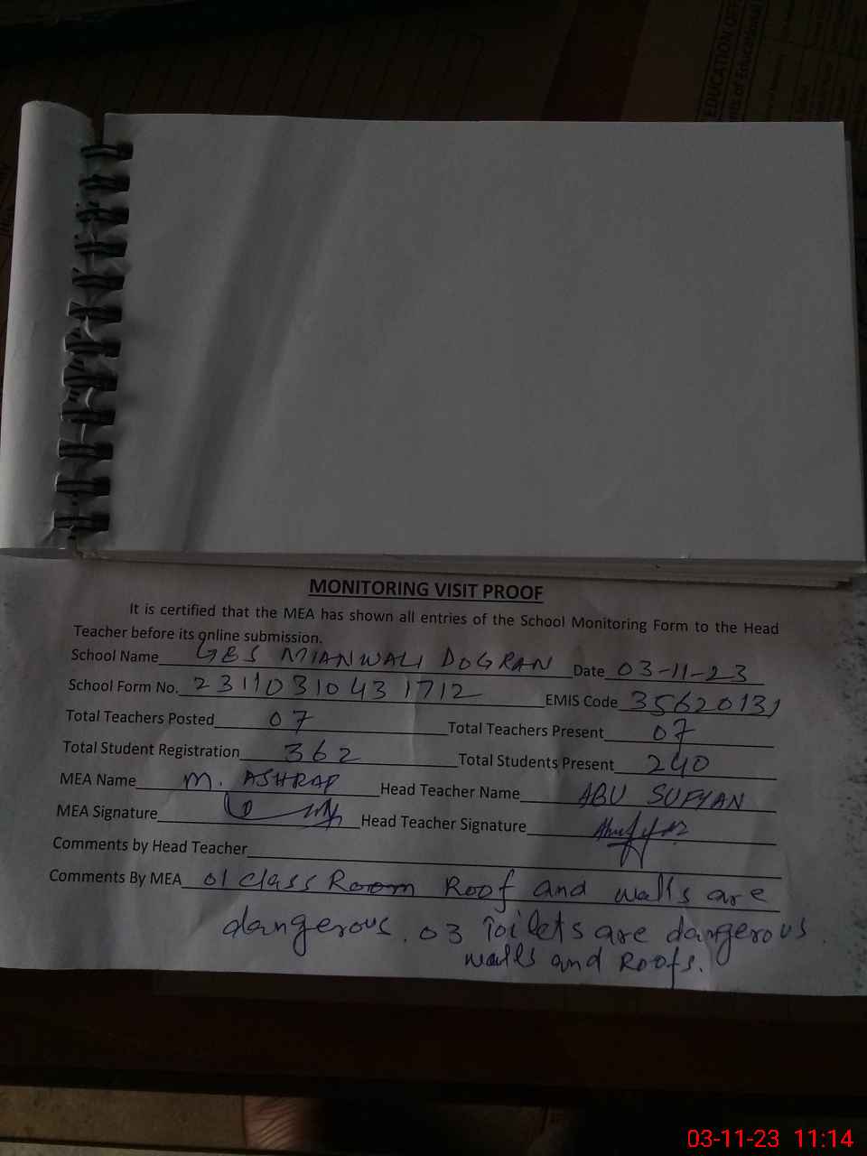 | Attendance Register | Head Teacher | MEA with School | Visit Proof |