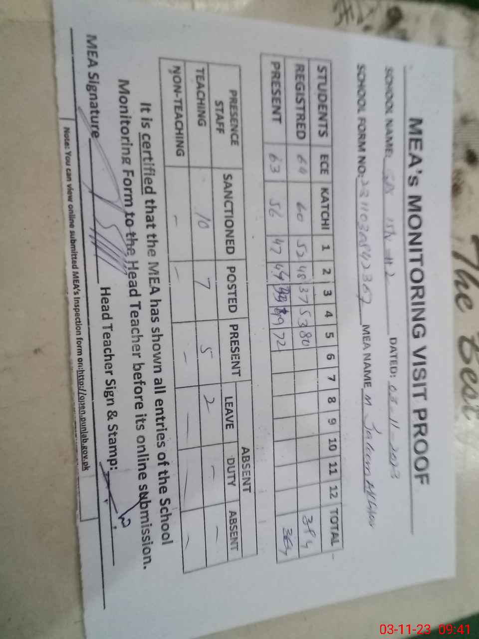 | Attendance Register | Head Teacher | MEA with School | Visit Proof |