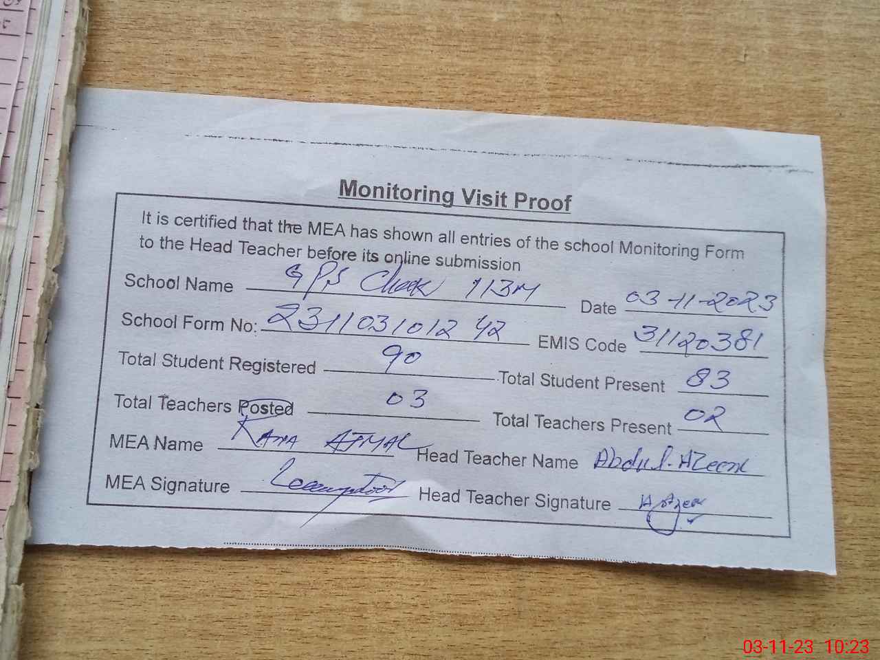 | Attendance Register | Head Teacher | MEA with School | Visit Proof |