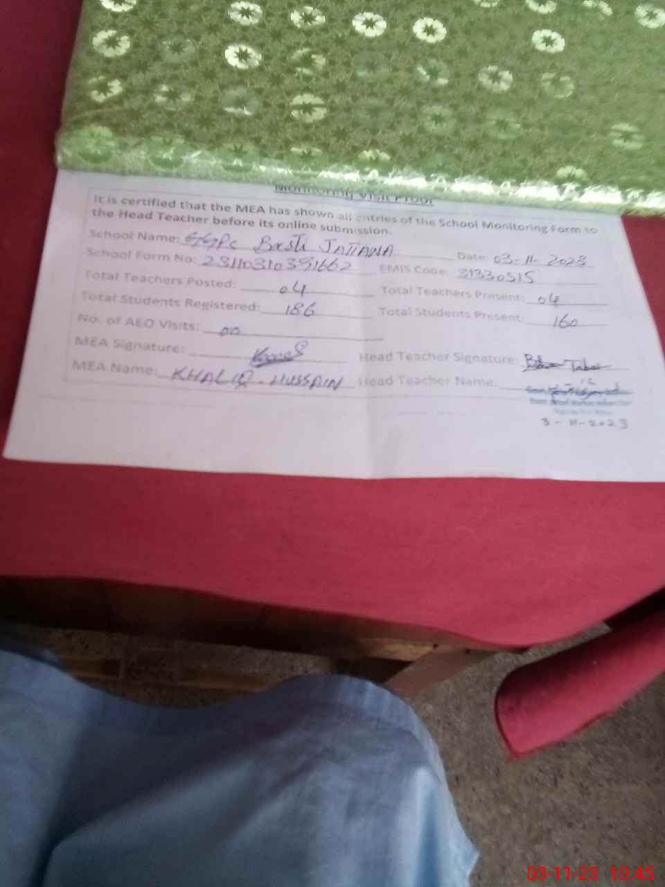 | Monitoring Date: 03-11-2023 | Start Time: 03-11-2023 10:14 AM | End Time: 03-11-2023 10:48 AM | Name of MEA: Kh**** Hu**** | |