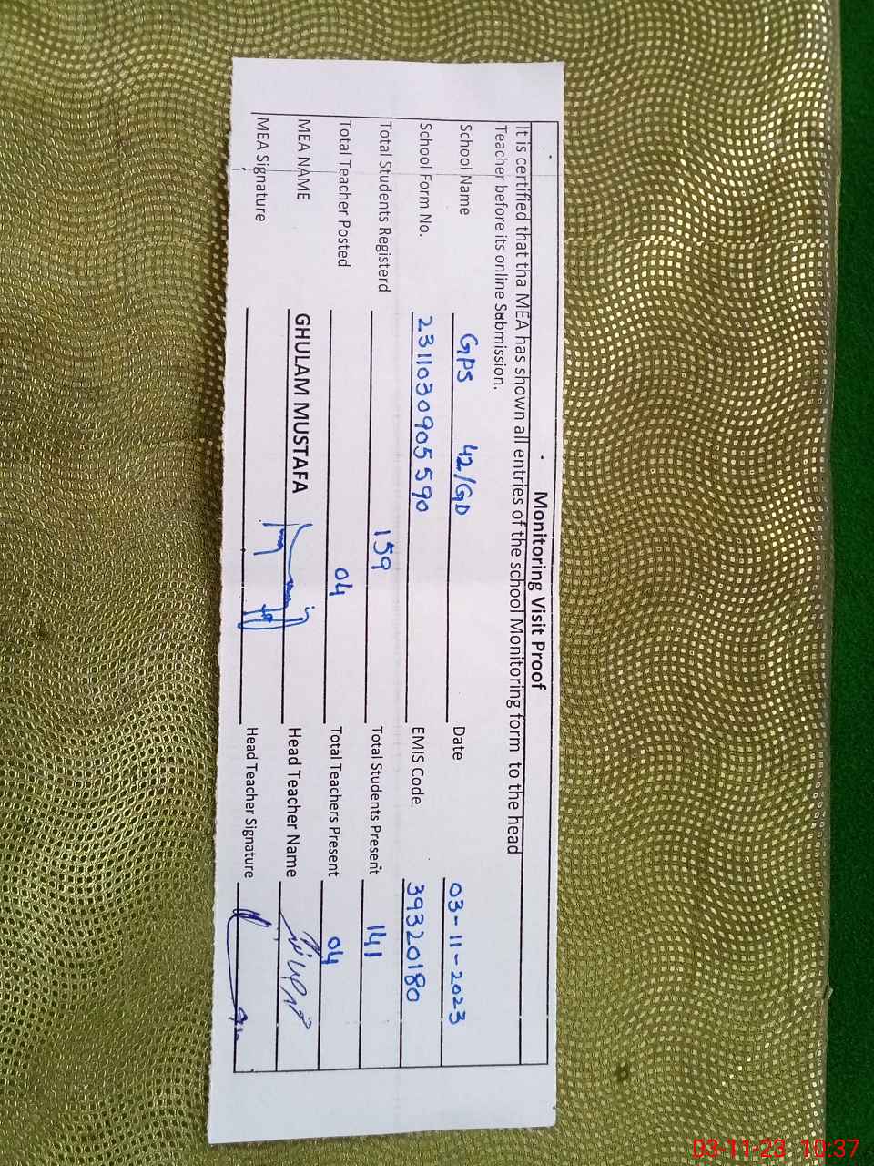| Remarks (Use Separate Page if Required): Students list for online attendance found contrary to the available record at school Lnd data still not uploaded therefore the test is not being conducted please School has a play ground which has partially boundry wall however portion of building has separate boundry wall Submitted please | |||||