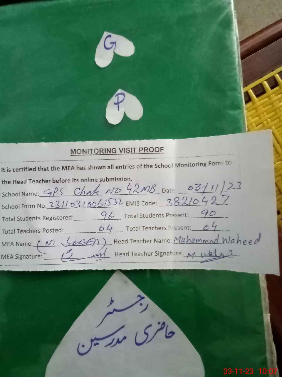 | Attendance Register | Head Teacher | MEA with School | Visit Proof |