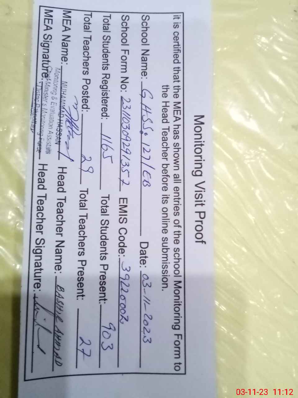 | Attendance Register | Head Teacher | MEA with School | Visit Proof |