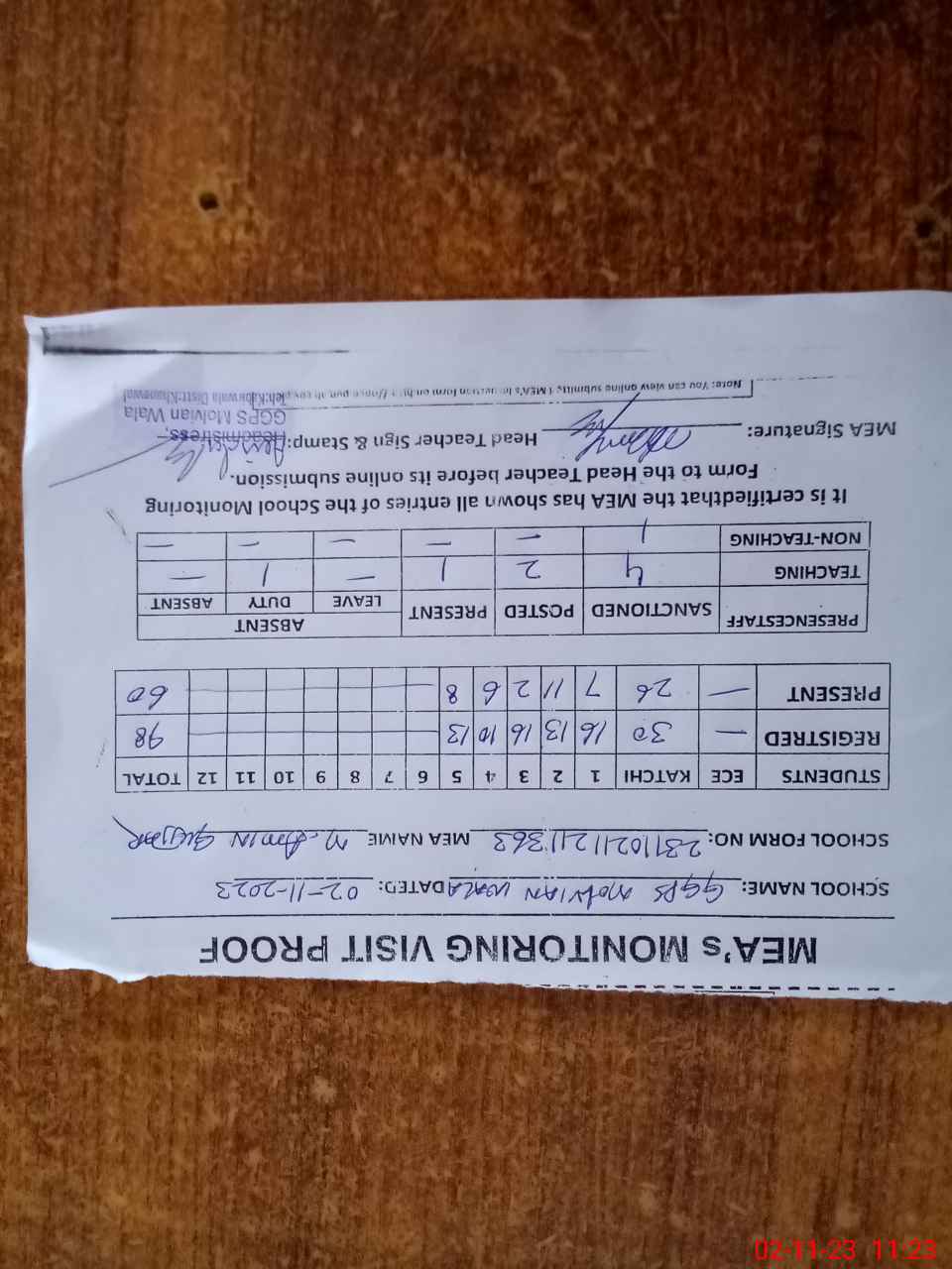 | Attendance Register | Head Teacher | MEA with School | Visit Proof |