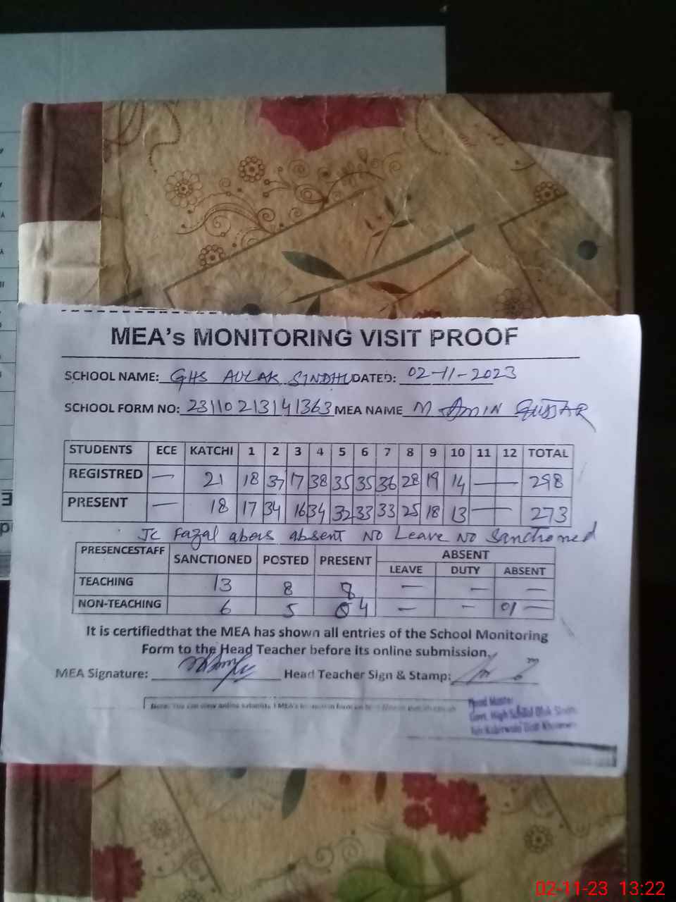 | Attendance Register | Head Teacher | MEA with School | Visit Proof |