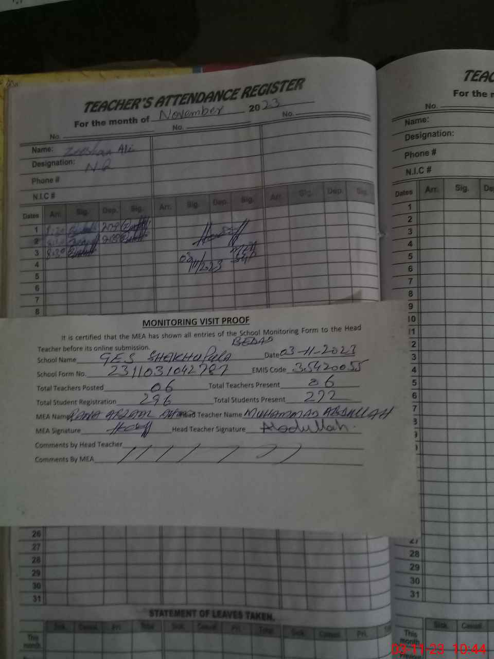 | Attendance Register | Head Teacher | MEA with School | Visit Proof |