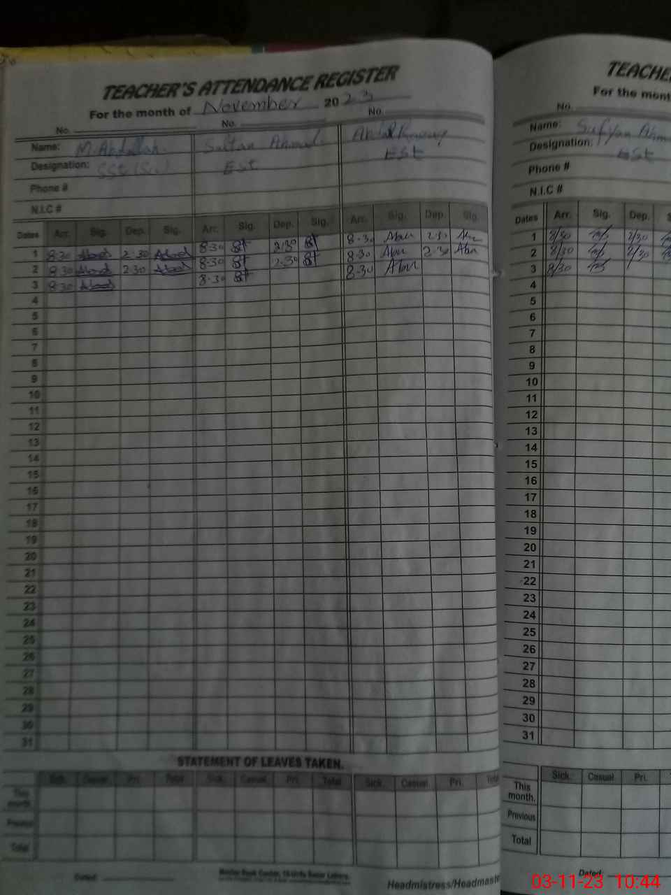 | Name: MU**** AB**** Designation: (School Headmaster's/Headmistress's) SST SCI Phone/Cell Number: 03**** |