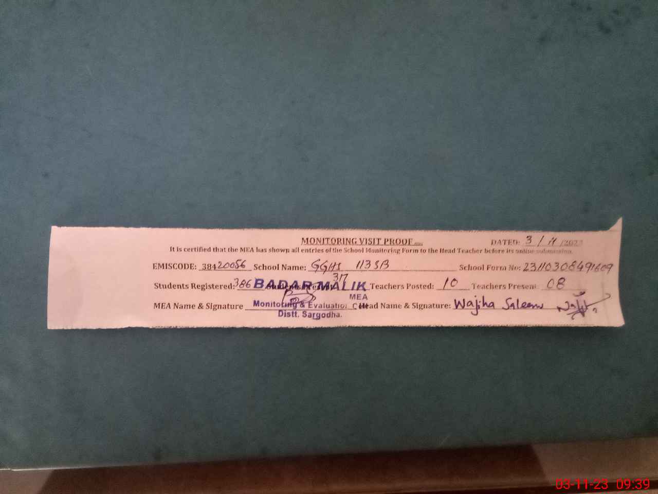 | EMIS Code: 38420056 | Name of School: GGHS CHAK NO.113 SB | |||