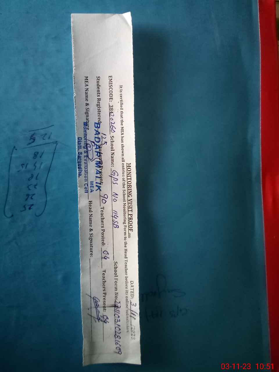 | Attendance Register | Head Teacher | MEA with School | Visit Proof |