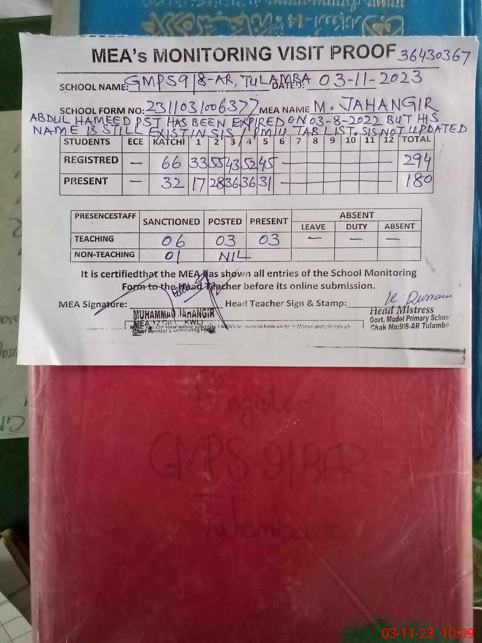 | Attendance Register | Head Teacher | MEA with School | Visit Proof |