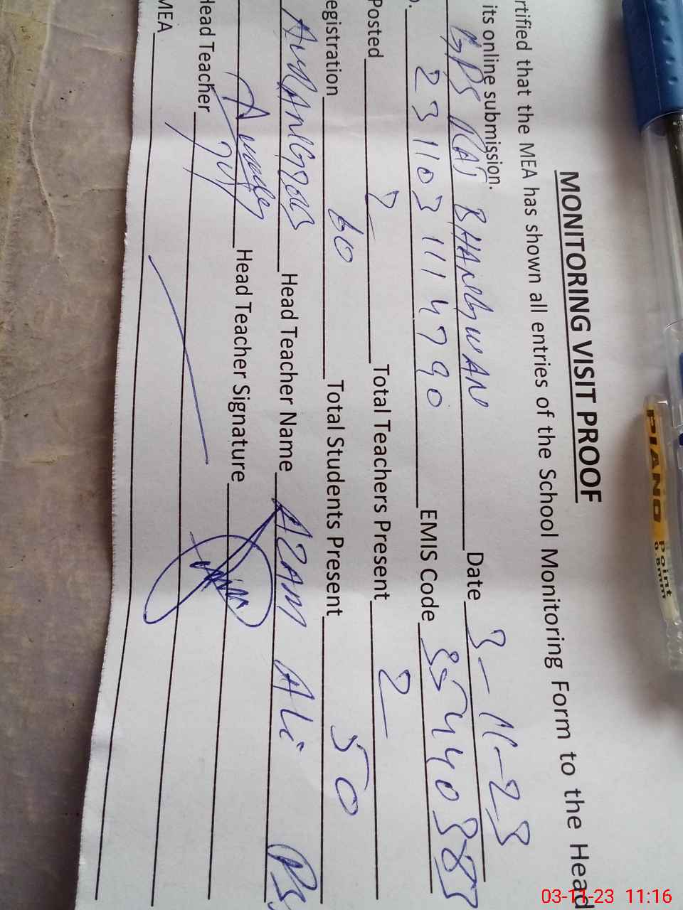 | Attendance Register | Head Teacher | MEA with School | Visit Proof |