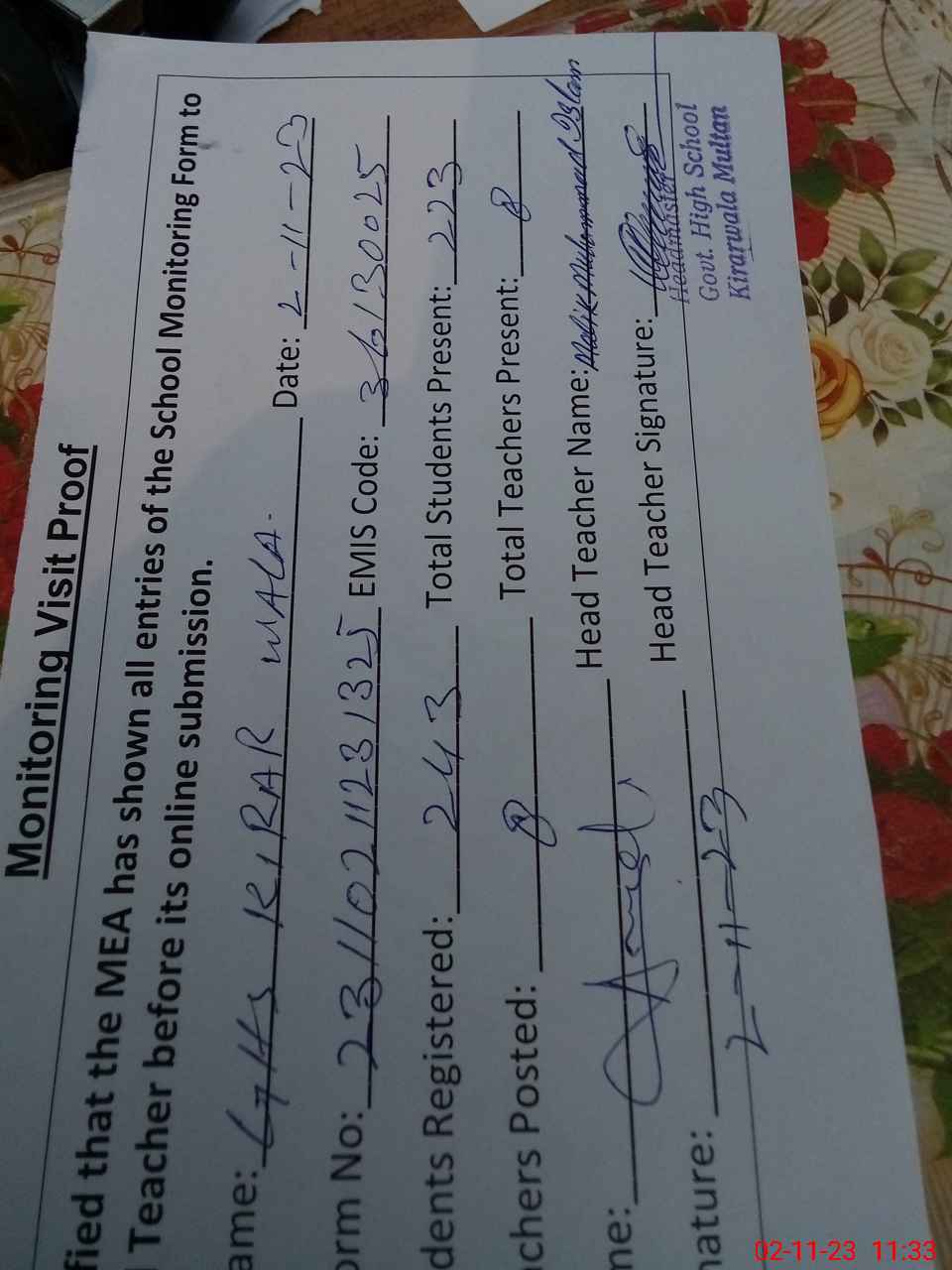 | EMIS Code: 36130025 | Name of School: GHS KIRAR WALA MULTAN | |||