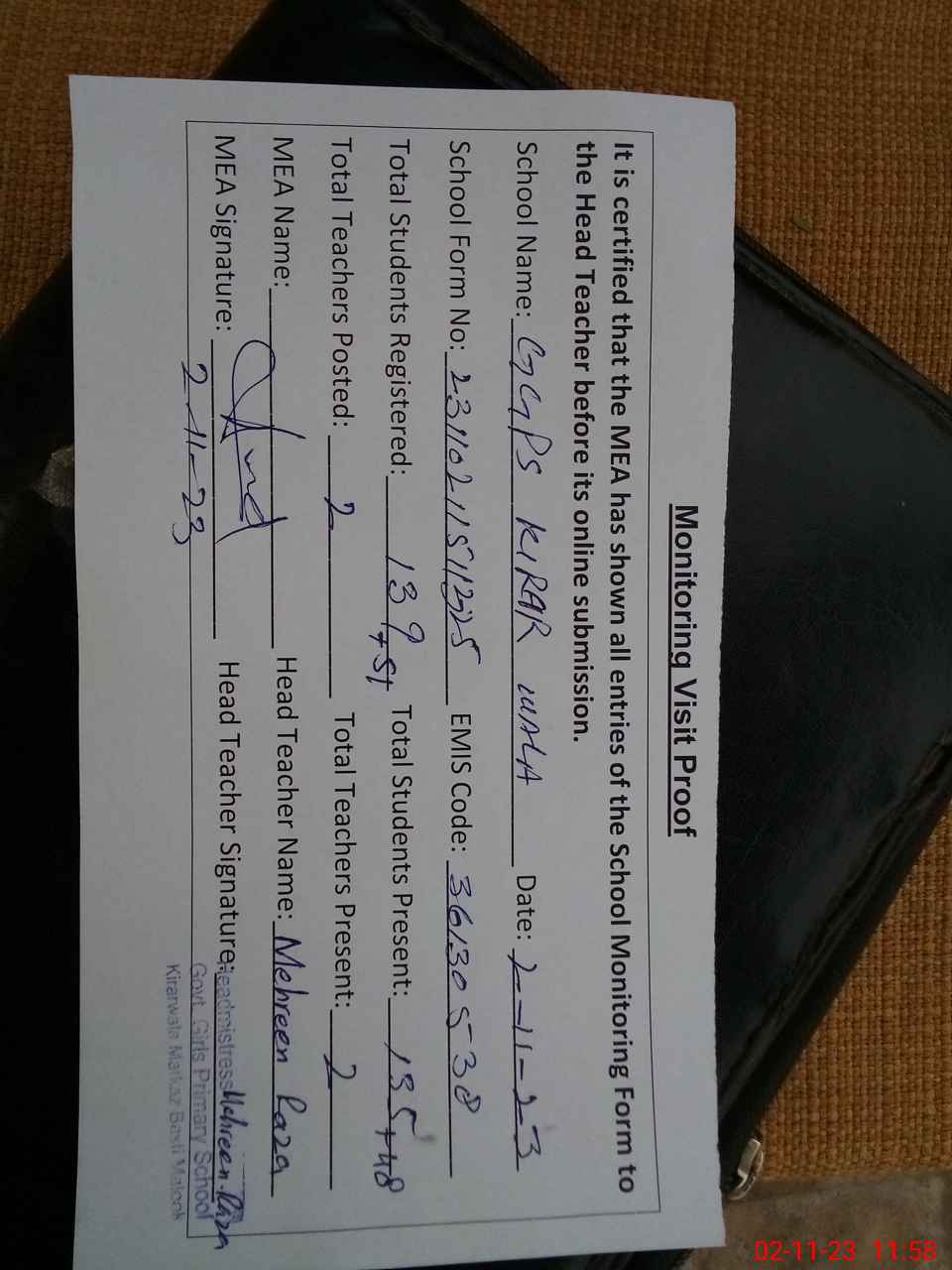 | Attendance Register | Head Teacher | MEA with School | Visit Proof |