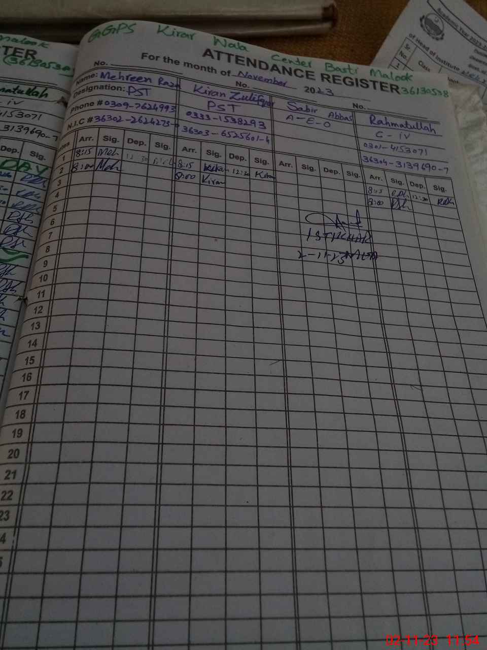 | CNIC | Full Name | Designation | R/C | Absence during last cal. month |