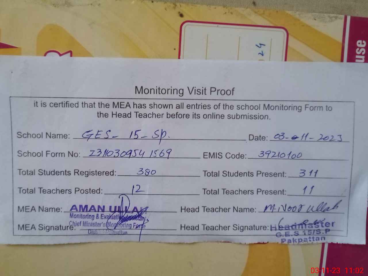 | Attendance Register | Head Teacher | MEA with School | Visit Proof |